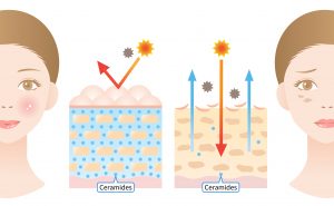 Ceramidele fortifică bariera protectoare a pielii, ajută la reținerea hidratării ajutând pielea să aibă un aspect mai ferm și mai “plin”. Acestea sunt practic lipide (grăsimi) ce se regăsesc în mod natural în pielea noastră. Factori nocivi precum soarele, poluarea și înaintarea în vârstă afectează aceste componente ale pielii, lăsând-o pe aceasta mai vulnerabilă (vezi imaginea de mai jos). Când bariera protectoare este compromisă, tenul începe să piardă hidratarea, este mai predispus la iritații și înroșire (exact opusul unui ten luminos și sănătos). Alege seruri cu ceramide sau creme hidratante ce conțin acest ingredient și fă-ți un obicei din a le folosi.